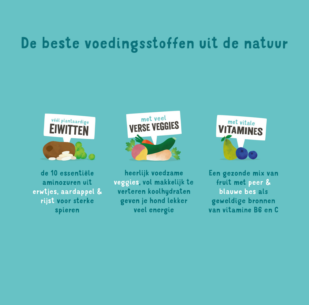 Samenstelling: verse groenten 20% (wortel 4%, courgette 4%, knolraap 3%, pastinaak 3%, aardappel 2%, bonen, erwten 1%, selderij), rijst 12,5%, rijsteiwit 11%, erwteneiwit 9%, zonnebloemolie, gist (gedroogd, inclusief mannan-oligosachariden (MOS)), plantaardige vezels, aardappeleiwit 4,5%, aardappel (gedroogd) 4%, erwtenzetmeel 3,5%, linzen (gedroogd), vegetarische saus, mineralen, luzerne (gedroogd), lijnzaad, erwten (gedroogd) 2%, zeewier (gedroogd), peer (gedroogd) 0,1%, cichorei (gedroogd), bosbessen (gedroogd) 0,05%, veenbessen (gedroogd), DHA-gold, marjolein (gedroogd).