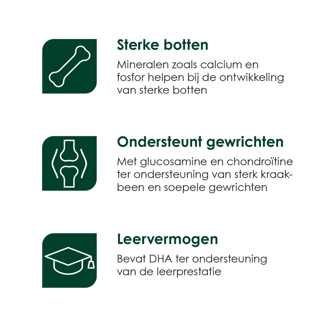 | Ondersteunt gewrichten Met glucosamine en chondroïtine ter ondersteuning van sterk kraakbeen en soepele gewrichten. |