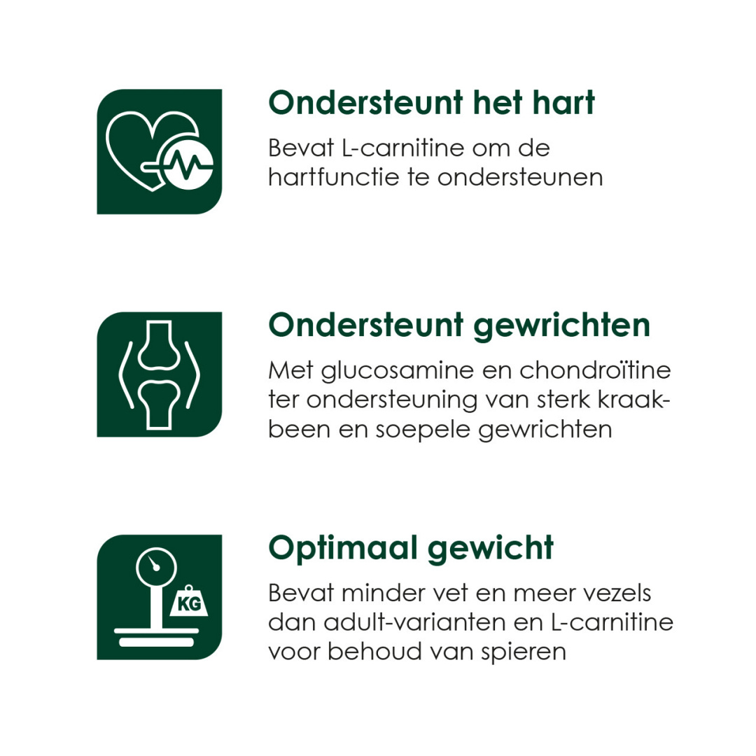 | Optimaal gewicht Bevat minder vet en meer vezels dan adult-varianten en L-carnitine voor behoud van spieren. |