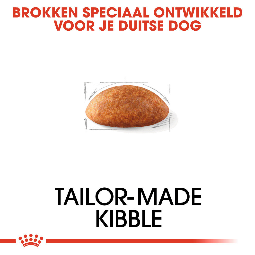 De vorm, textuur, samenstelling en het formaat van de brok zijn aangepast op de Duitse dog: de brok zorgt ervoor dat de snelheid van de voedselinname wordt vermindert en stimuleert het kauwen.