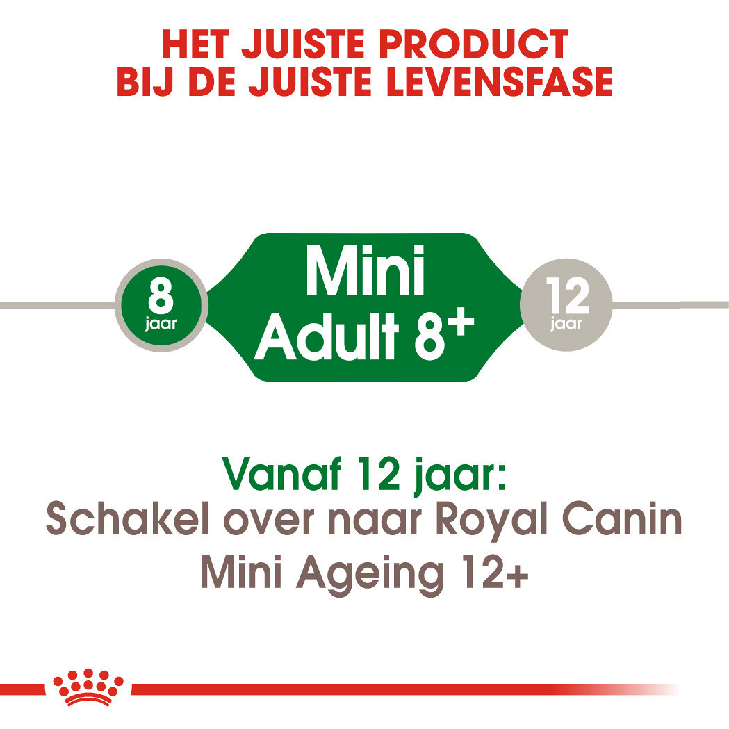 Royal Canin Mini Adult 8+ gebruikt een "anti age complex" dat de effecten van veroudering helpt vertragen.