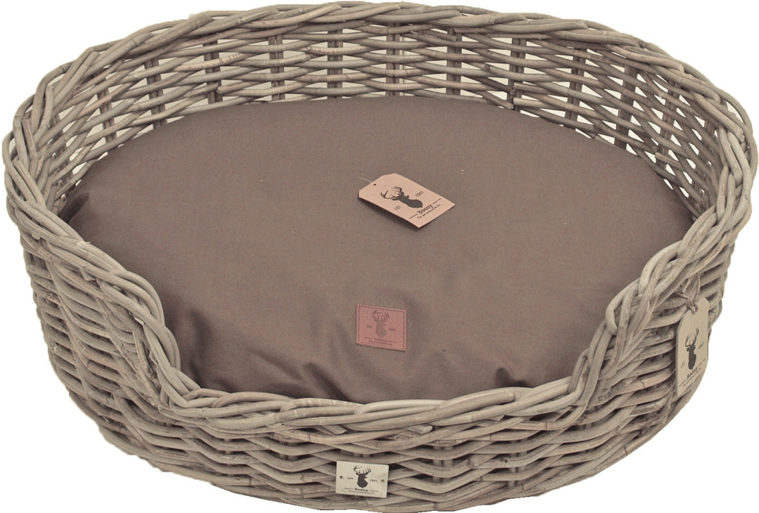 In een ovalen vorm waardoor het Boony EST. 1941 ovalen kussen er perfect in past. Dit kussen is los verkrijgbaar.
