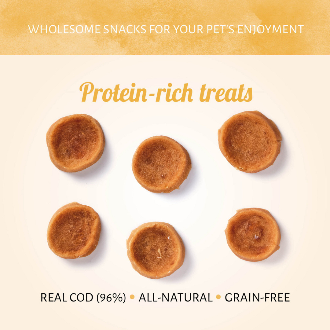Graanvrije snack met vis als hoofdingrediënt. Rijk aan eiwitten.