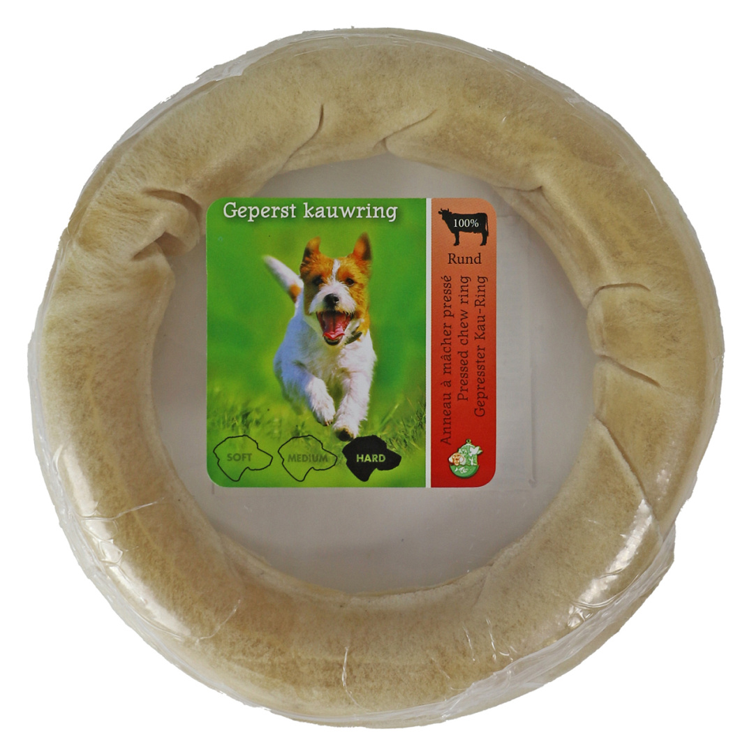 Deze zwaargeperste ring van buffelhuid is 100% natuurlijk en van de beste Thaise kwaliteit. Het kauwen van deze ring is daarnaast goed voor het gebit van de hond.