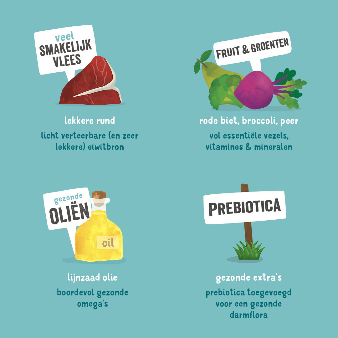 Samenstelling: rund 60%, wortel 2%, broccoli (gedroogd) 0,5%, mineralen, mannan-oligosachariden (MOS), lijnzaadolie, fructo-oligosachariden (FOS), rode bieten (gedroogd) 0,13%, peer (gedroogd) 0,08%, gedroogde venkel 0,01%, gedroogd karwijzaad 0,01%, gedroogd duizendblad 0,01%, gedroogde braambessenblaadjes 0,01%, gedroogde maretak 0,01%, gedroogde kamillebloesem 0,01%, gedroogde gentiaanwortel 0,01%, gedroogd duizendguldenkruid 0,01%