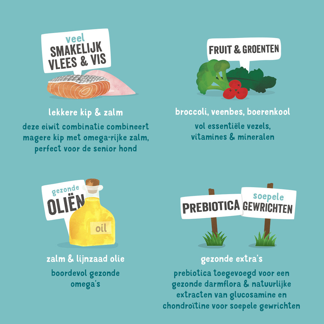 Samenstelling: kip 50%, ASC* zalm 10%, aardappel 4%, erwten 2%, broccoli (gedroogd) 0,5%, mineralen, mannan-oligosachariden (MOS), lijnzaad, zalmolie, fructo-oligosachariden (FOS), spinazie (gedroogd) 0,06%, bosbessen (gedroogd) 0,05%, veenbessen (gedroogd) 0,05%, glucosamine, chondroitin sulphate, gedroogde venkel 0,01%, gedroogd karwijzaad 0,01%, gedroogd duizendblad 0,01%, gedroogde braambessenblaadjes 0,01%, gedroogde maretak 0,01%, gedroogde kamillebloesem 0,01%, gedroogde gentiaanwortel 0,01%, gedroogd duizendguldenkruid 0,01%