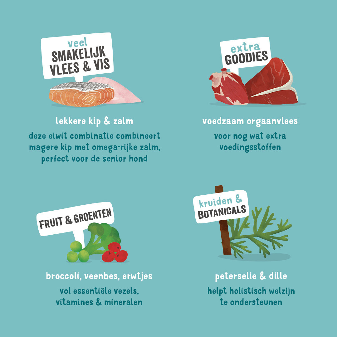 Samenstelling: kip 42%, zalm 14%, mineralen, erwten 2%, bataten 1%, pompoen 1%, broccoli 1%, cranberry's 1%, peterselie 0,1%, dille 0,1%.