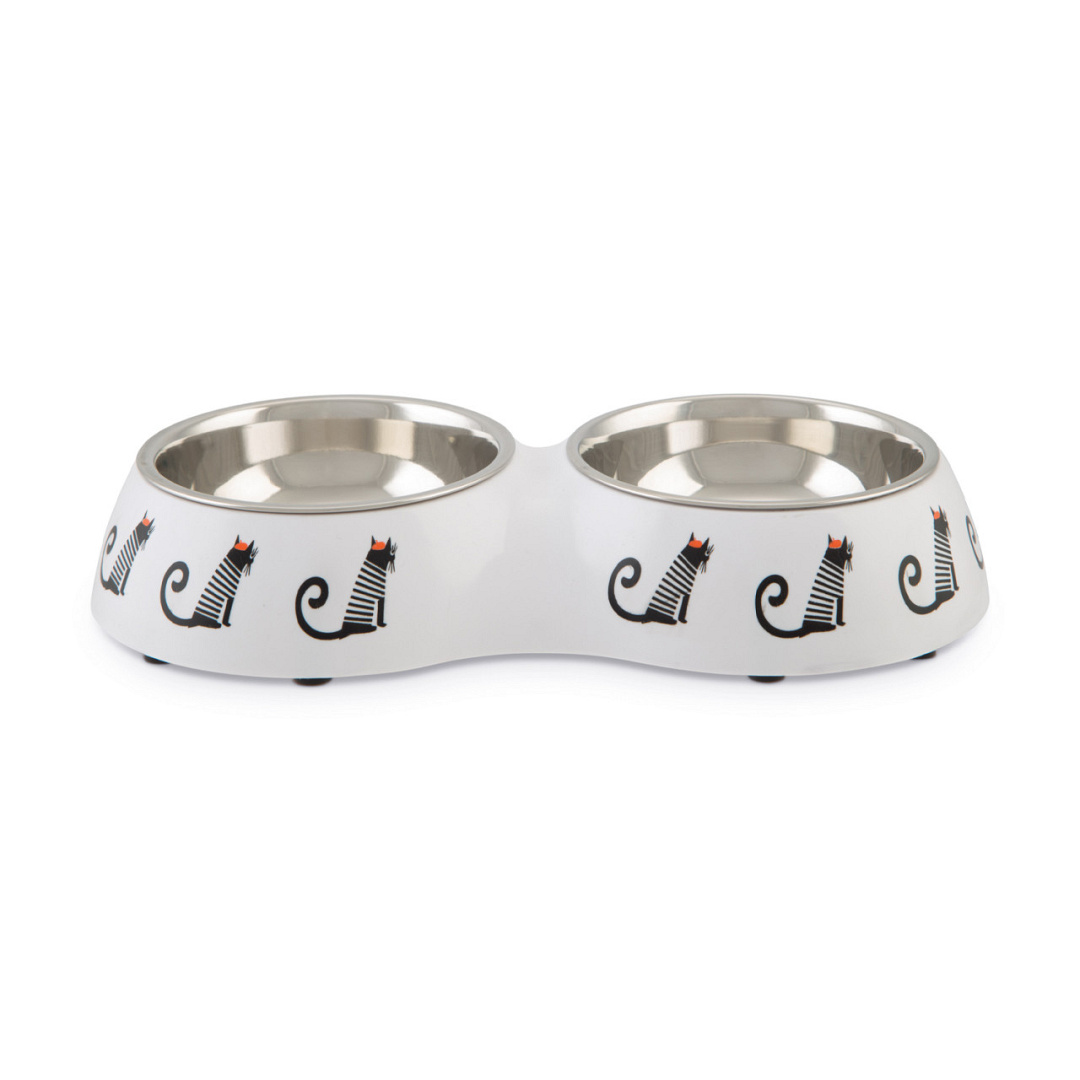 Om deze vrolijke dinerset nog leuker te maken, zijn deze voer- en drinkbak aan de voorkant voorzien van kattenfiguurtjes.