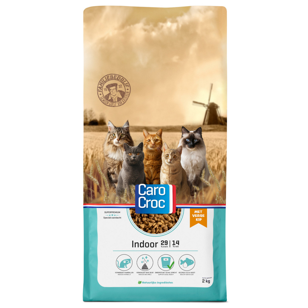 Het bevat een verlaagd energiegehalte en de toevoeging van natuurlijke vezels in CaroCroc Indoor helpt de vorming van haarballen te verminderen. Het toegevoegde zalmolie ondersteunt de huid- en vachtconditie. Daarnaast bevat CaroCroc Indoor extracten van de yucca plant die bijdragen om de geur van de ontlasting te verminderen.