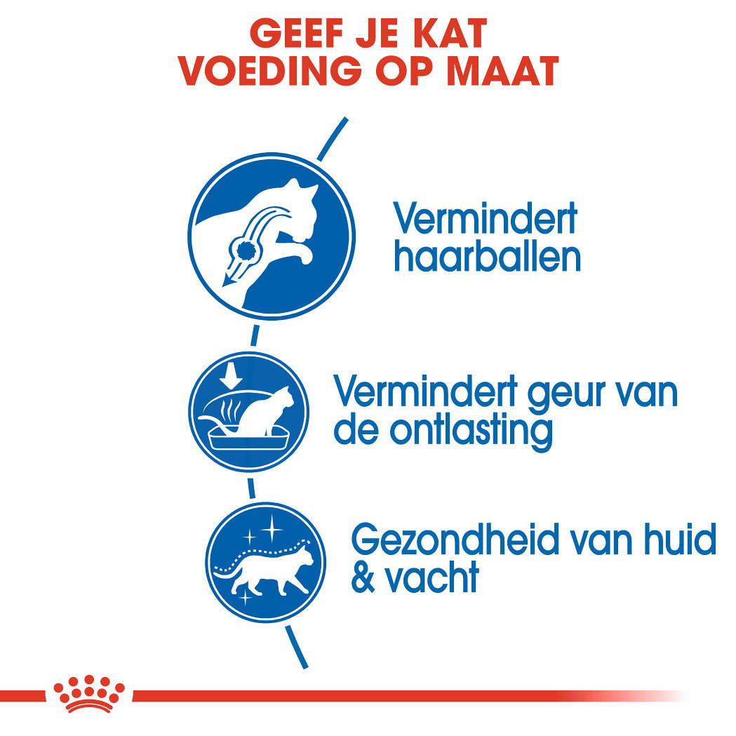 Katten die binnenshuis leven besteden meer tijd aan de verzorging van hun vacht. De ruwe tong werkt als een borstel. Losse, dode haren worden meegenomen. Als deze haren worden ingeslikt komt het in het spijsverteringskanaal. Hier kunnen zich haarballen vormen. Je kat braakt deze haarballen weer uit of worden uitgescheiden via de ontlasting. Voeding speelt een belangrijke rol om dit proces op een natuurlijke manier effectiever te laten verlopen.