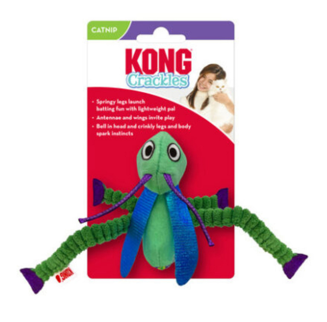 De Kong Cracklez Grasshopper's veerkrachtige poten en lichte lichaam maken hem ideaal om mee te spelen en stoeien, voor talloze momenten van plezier. Een bel binnenin het glimlachende hoofd van deze sprinkhaan, knisperende vleugels, onweerstaanbare antennes en glanzende vleugels nodigen uit tot nog meer speelmomenten en zorgen ervoor dat katten blijven spelen, terwijl Kong North American Premium Catnip in het speeltje het spel bevordert.