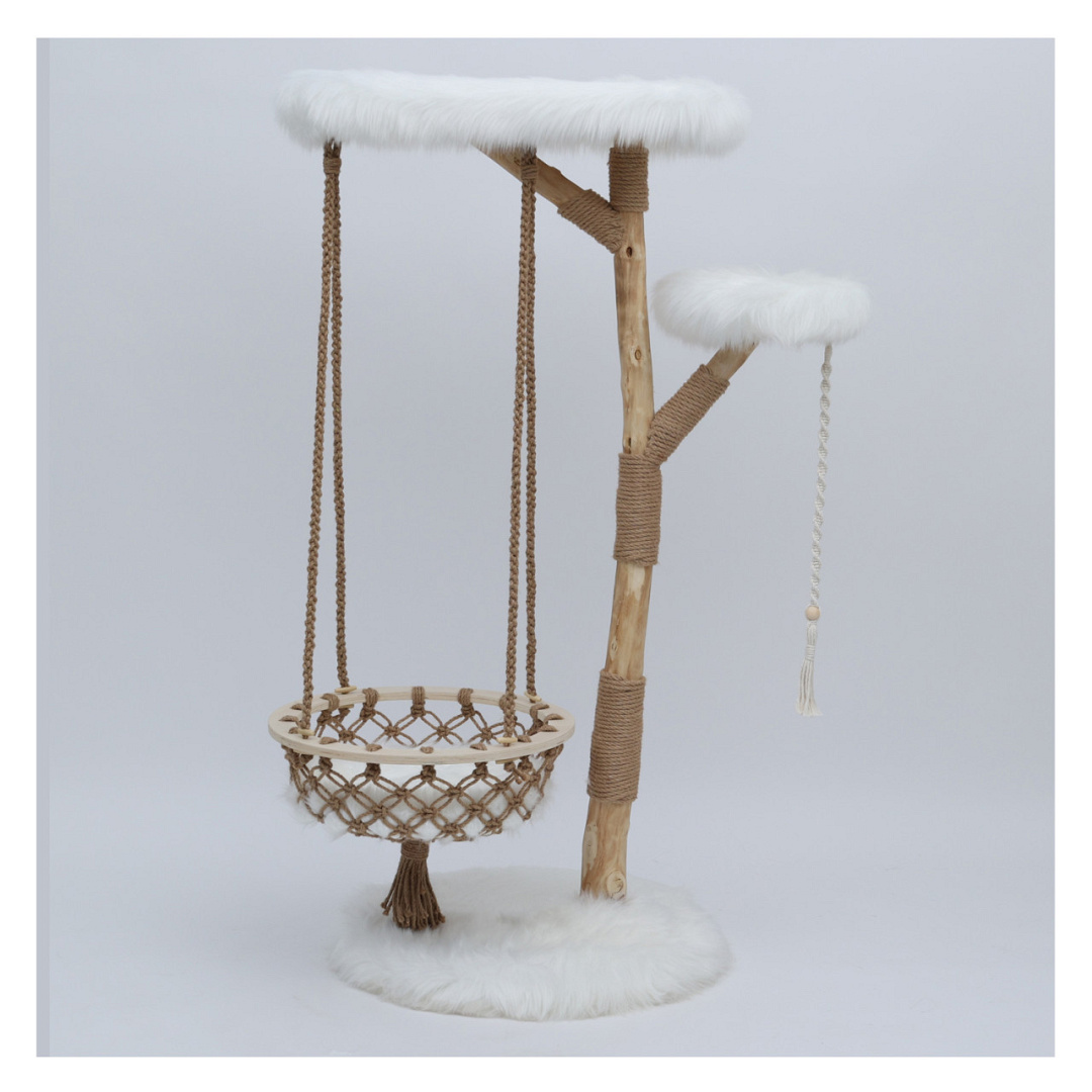 De plateaus zijn voorzien van comfortabel langharig pluche wat de klimboom een superluxe uitstraling geeft. Op strategische plaatsen is de boom omwikkeld met sisal waar je kat lekker aan kan krabben. Een heerlijke comfortabele hangmat/schommel maakt het geheel af om jouw kat te voorzien van een ultieme hangout.
