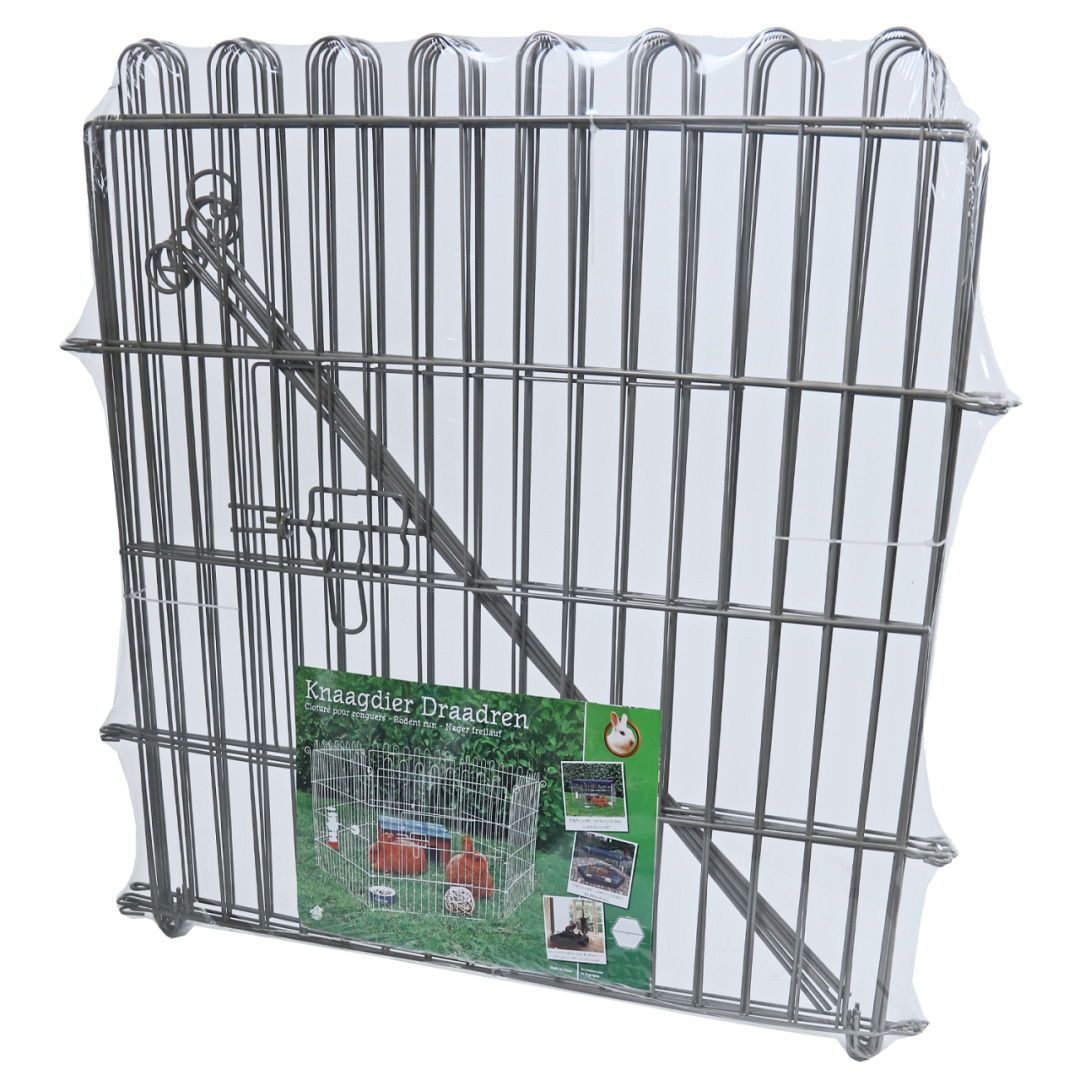 De ren bestaat uit 6 panelen met een afmeting van 67 x 60 cm per paneel. In één paneel zit ook een deurtje.