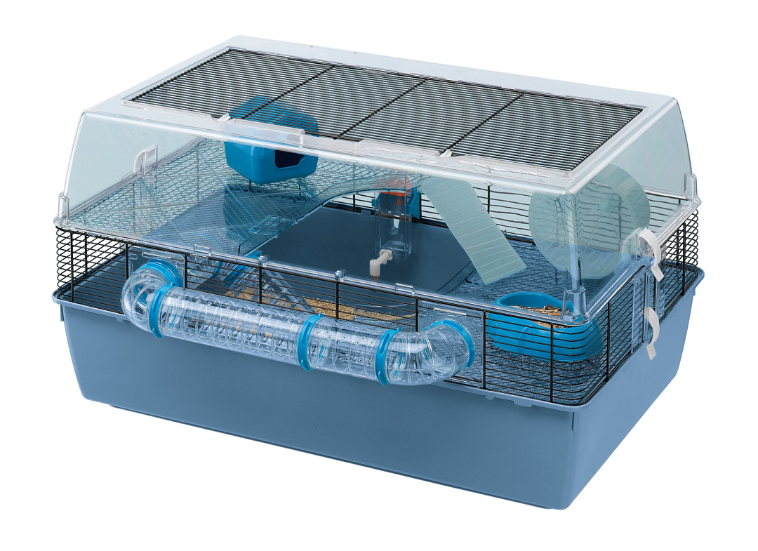 De kooi bestaat uit twee delen: een dak en een plastic basis met een centraal deel van gaas, speciaal ontworpen om een goede ventilatie in de leefomgeving te garanderen.