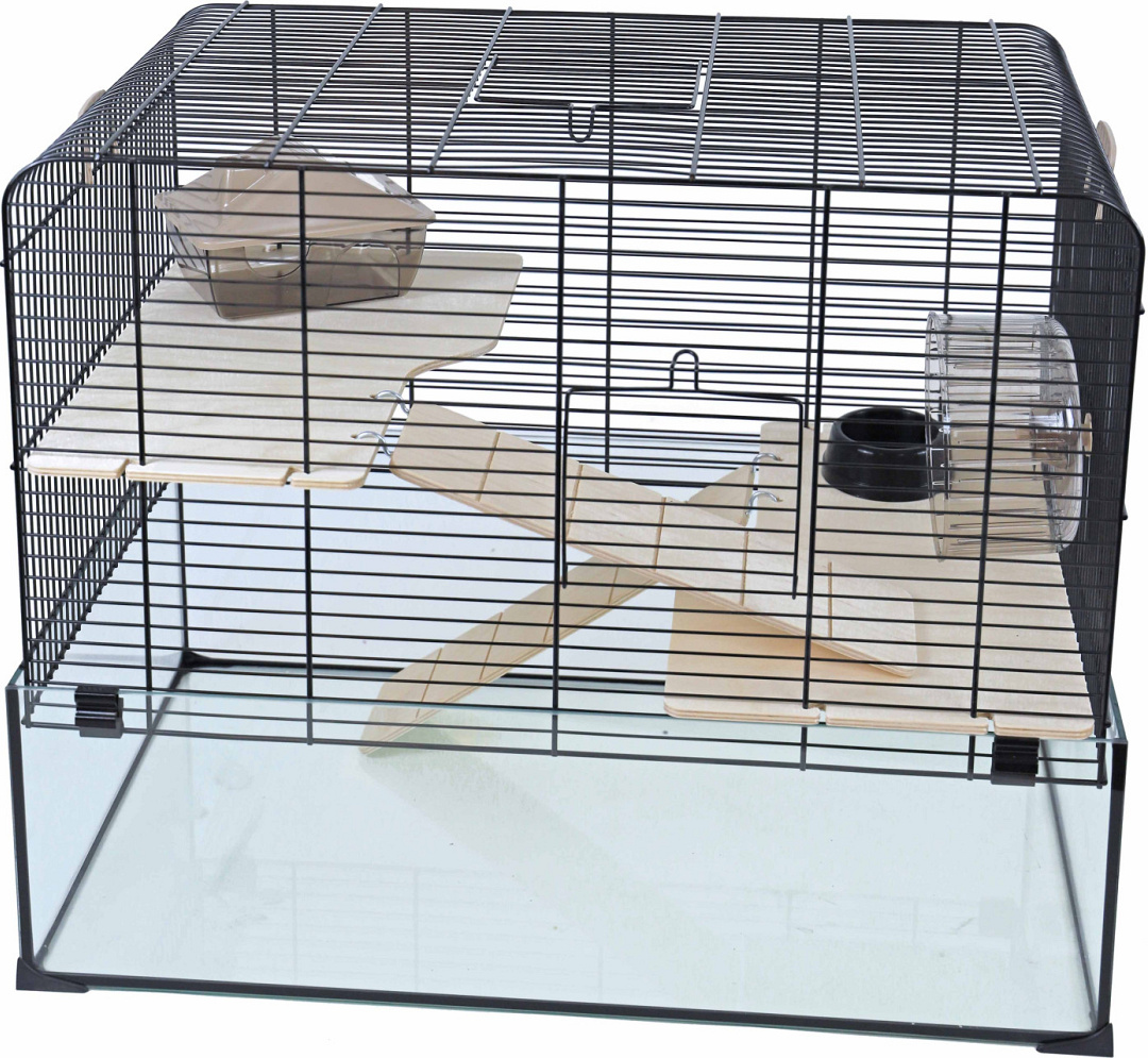 Deze kooi beschikt over een glazen onderbak, die graven zonder morsen mogelijk maakt, en heeft een tralie-bovenkant met twee houten plateau's. De verdiepingen zijn met elkaar verbonden door middel van trappetjes en zijn aangekleed met een slaaphuisje, voerbakje en hamsterwiel.